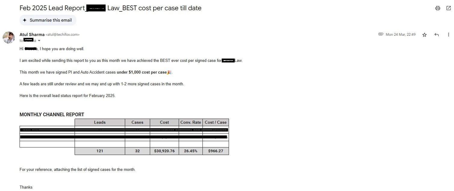 - Implemented advanced lead tracking using our proprietary Legal Lead Accelerator (LLA) framework — measuring not just leads, but signed cases.